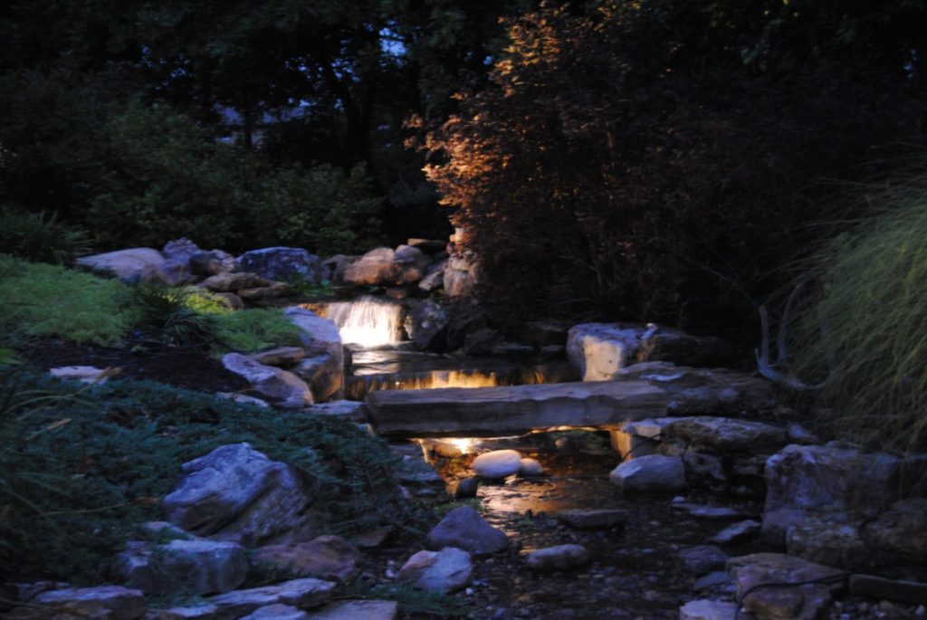 - Uplighting – also known as “washing,” illuminates an object or tree from a distance below and from in front (rather than at the base). This makes the object or tree appear to be glowing and highlights the intricacies of the object. These lights can be tilted horizontally or vertically as the season or tree and plant life changes. Great for adding areas of strong lighting.